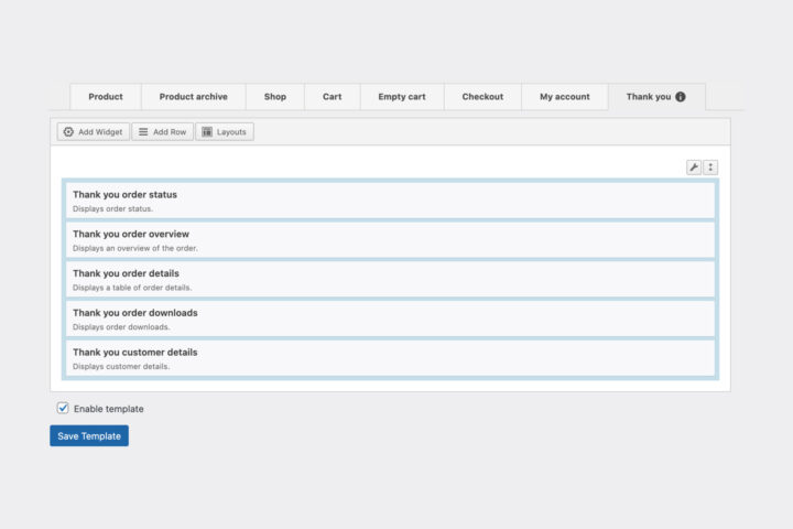 The SiteOrigin Premium WooCommerce Template Builder brings the power of Page Builder to WooCommerce. Version 1.21.0 introduces a new template and widgets to customize the WooCommerce Thank You page. The Thank You page follows checking out and provides users with an order status, summary, and other information.