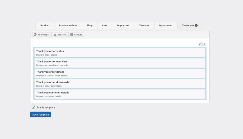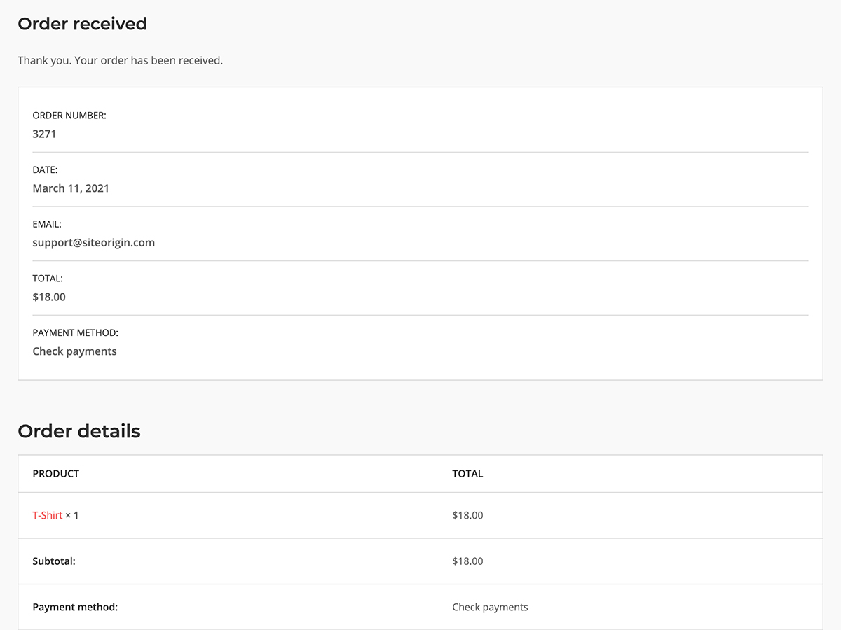 The SiteOrigin Premium WooCommerce Template Builder brings the power of Page Builder to WooCommerce. Version 1.21.0 introduces a new template and widgets to customize the WooCommerce Thank You page. The Thank You page follows checking out and provides users with an order status, summary, and other information.