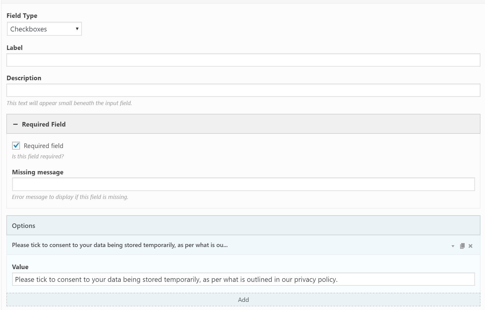To ask for consent, add a checkbox to your contact form and use the following values: