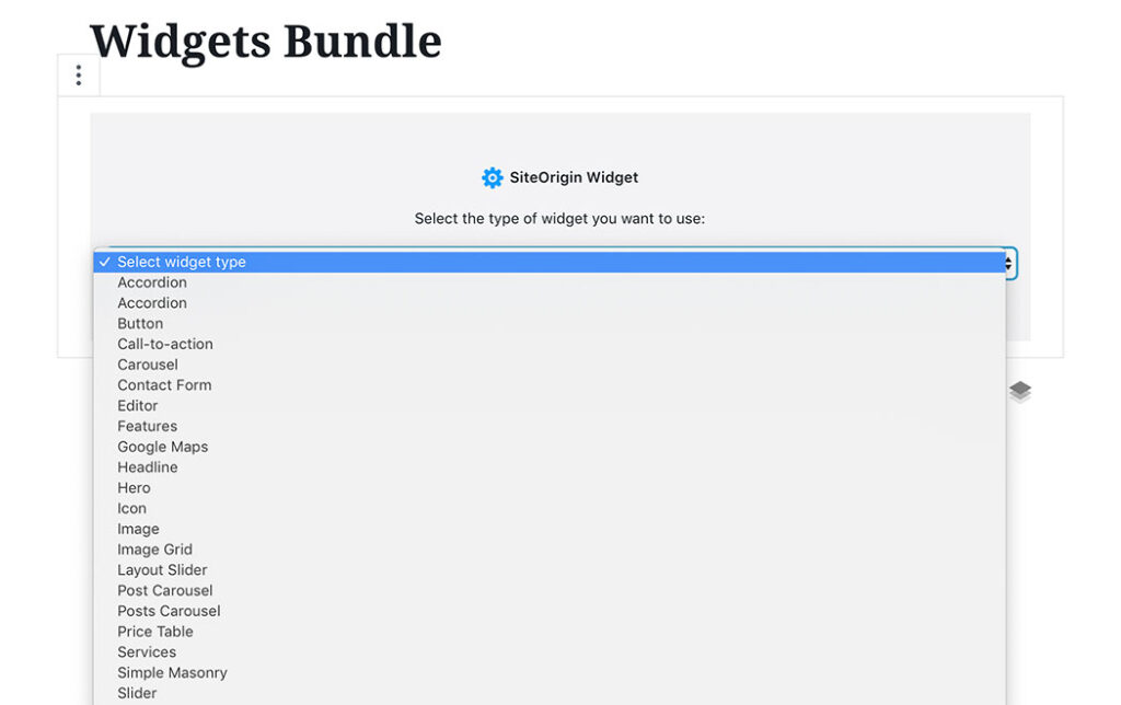Gutenberg will be the new WordPress editor from version 5.0; it’s currently being tested in plugin form. If you’ve been giving Gutenberg a try, you might have already used the SiteOrigin Layout block which offers a full instance of Page Builder in Gutenberg. We’re really excited to announce that from version 1.13.0, the SiteOrigin Widgets Bundle is now also available as a block. The new Widgets Bundle block allows you to directly add SiteOrigin widgets to your Gutenberg pages.
