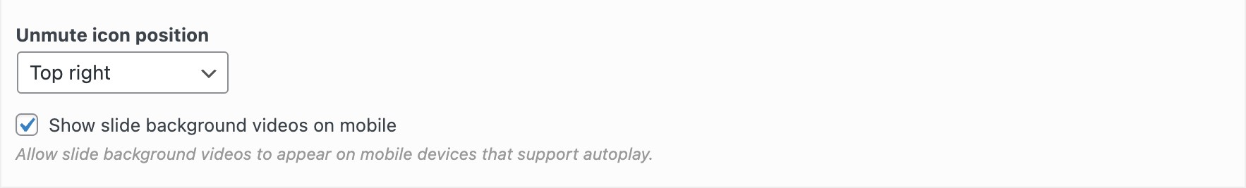 Slide background videos are muted. Enable to display an unmute/mute icon. Only applies to self-hosted videos.